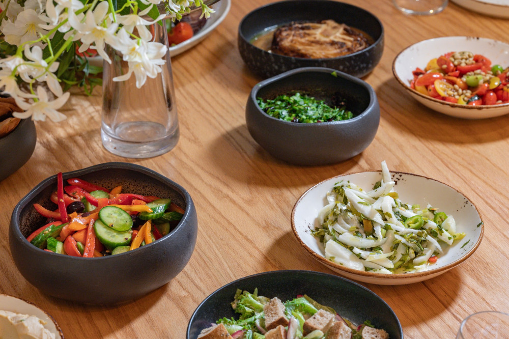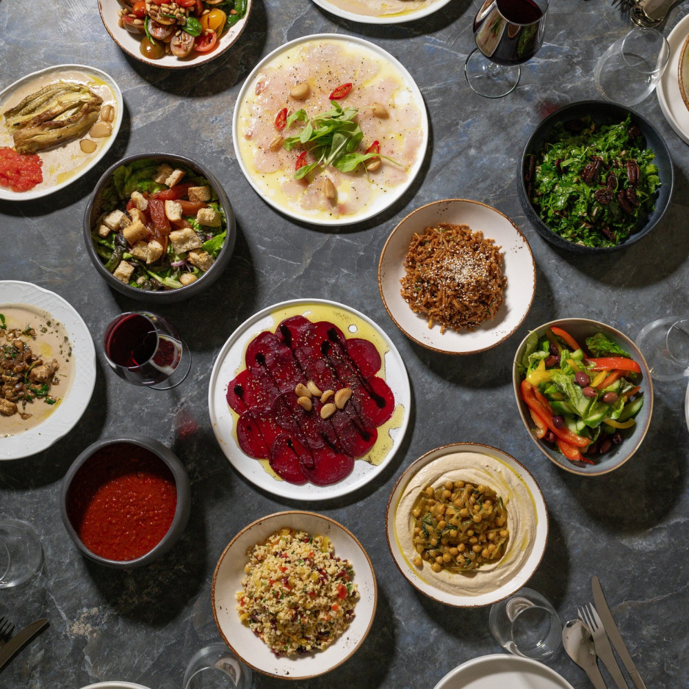 סלטי שף ייחודיים כמו ליבת חצילים בליווי טחינה חמה וקרפצ'יו עגבניות.