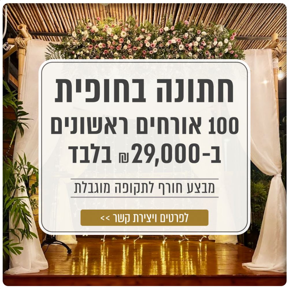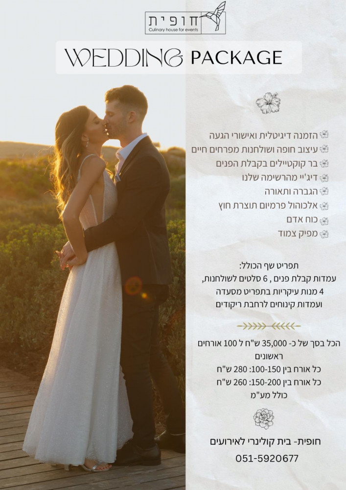 צוות מנוסה ומקצועי בתחום האירועים. בנוסף, בחופית אירועים האווירה היא של מטבח פתוח בו אתם יכולים להתרשם ולהתפעל מהיופי של הכנת מאכלי הגורמה המשובחים ביותר לאירוע שלכם. אצל חופית אירועים תקבלו גם מערכת הגברה ותאורה איכותית, כדי להפוך את האירוע שלכם לטוב ביותר עבורכם. חופית אירועים נמצאת במיקום מושלם לא רחוק ממרכז הארץ ומצפון הארץ, מה שהופך את הגישה למקום לנוחה במיוחד, עבור האורחים המגיעים מרחבי הארץ, לאירוע שלכם. האורחים יוכלו ליהנות מחנייה מרווחת וגדולה במיוחד, כדי לקבל את פניהם של האורחים הנרגשים. אם אתם מעוניינים במקום שיפיק לכם אירוע ברמה גבוהה, אירוע יוקרה עם צוות עובדים מנוסה ומיומן בתחום, אז נוכל להמליץ לכם לפנות אל חופית אירועים כדי ליהנות מאירוע שכמותו לא חוויתם בעבר, אירוע מושלם ומדויק, כדי להעניק לכם אירוע בלתי נשכח. אין ספק שאם תבחרו בחופית אירועים לחתונה או לבת מצווה לכם וליקרים לכם, אז תזכו באירוע איכותי ומשובח, החל מהרמה הטכנית של הגברה ותאורה ועד לרמת הקולינריה, למצוינות בשירות שתקבלו, לאורך כל האירוע. חתונה או בת מצווה או בר מצווה, למשל, הם אירועים של פעם בחיים, ולכן חשוב לבחור במקום הטוב ביותר, שיעניק לכם חוויה בלתי נשכחת ומרגשת במיוחד, בדיוק לפי כל מה שרציתם, לאירוע אקסקלוסיבי, לכם ולאורחים המגיעים לאירוע הפרטי או האירוע העסקי שלכם. אז מדוע אתם מחכים, צרו קשר כבר היום עם צוות חופית אירועים, כדי להתחיל להפיק את האירוע החלומי שלכם, לחתונה או אירוע עסקי או בת מצווה או בר מצווה, או כל אירוע שתרצו לארגן בהפקה בלתי נשכחת ומושלמת!