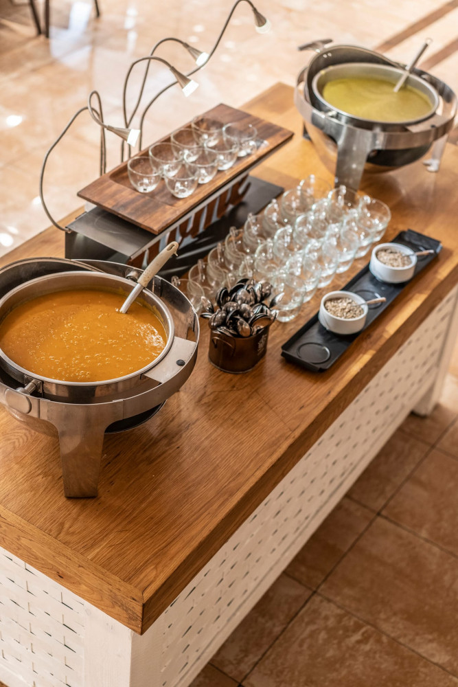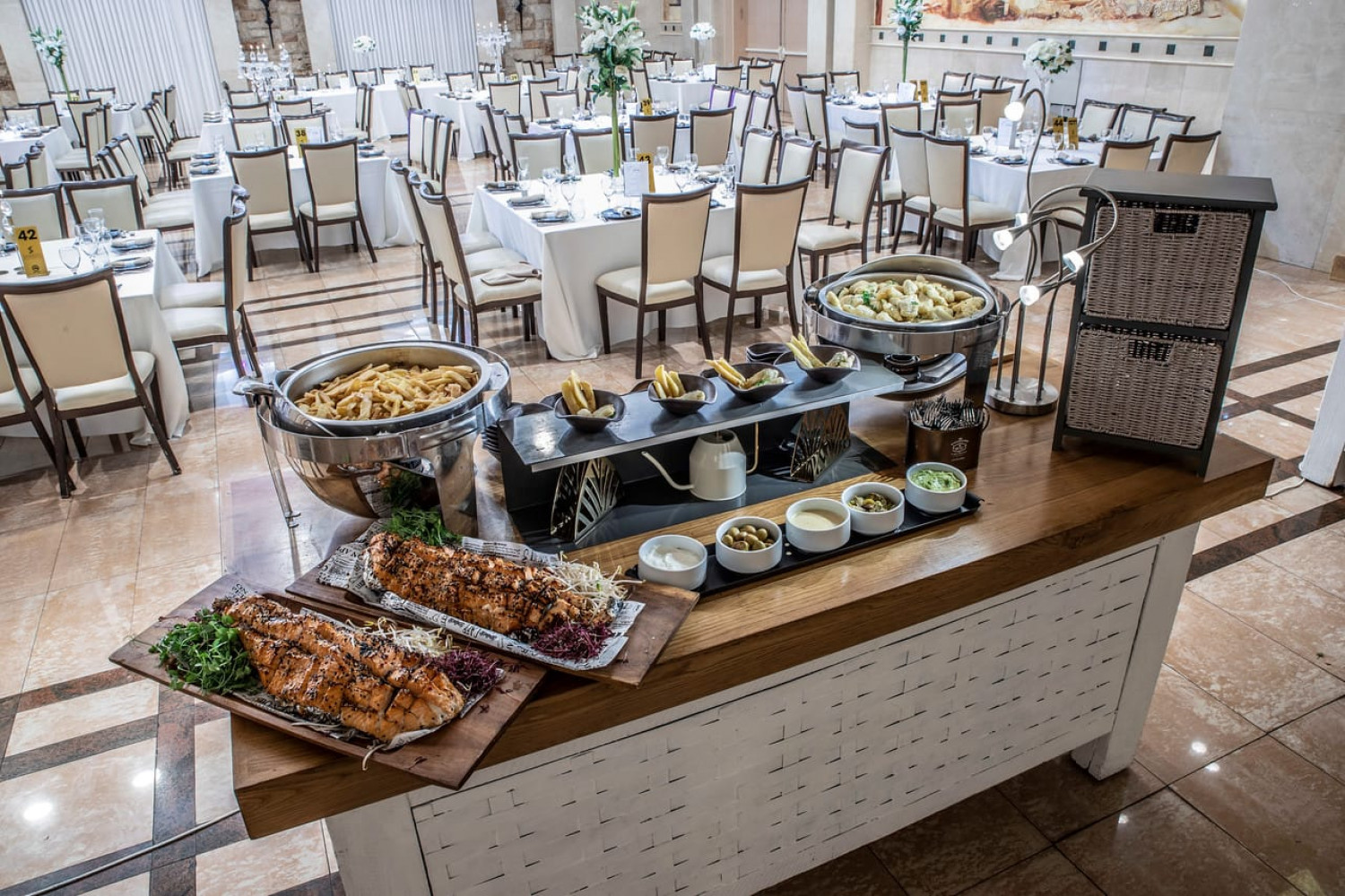 האוכל הכשר למהדרין מבושל לעיני האורחים במטבח פתוח, מה שתמיד מהווה אטרקציה בכל אירוע. מנות חצילים קלויים עם טחינה וסלסלת עגבניות פיקנטית, פוקצ'ות טריות וחמות עם בשר בקור טחון מעל רוטב עגבניות עשיר ועשבי תיבול, מבחר סלטים טריים ומבושלים מחומרים טריים: סלט גזר, מטבוחה, סלט טאבולה, סלט סלק, סלט כרוב, חזה עוף בגריל בתיבול מעולה, קבב טלה ישר מהאש, פטריות שלמות מטוגנות בפירורים זהובים, פרגיות, פוקצ'ות עם זעתר ושמן זית איכותי, סטייק אנטריקוט משובח ועוד מאכלים מפתים - הכל מוגש בפרזנטציה עכשווית ורעננה. גם קינוחי הבית שמהווים סיומת מתוקה לאירוע מושלם, מאופיינים בטעמים משובחים ומראה אסתטי.
